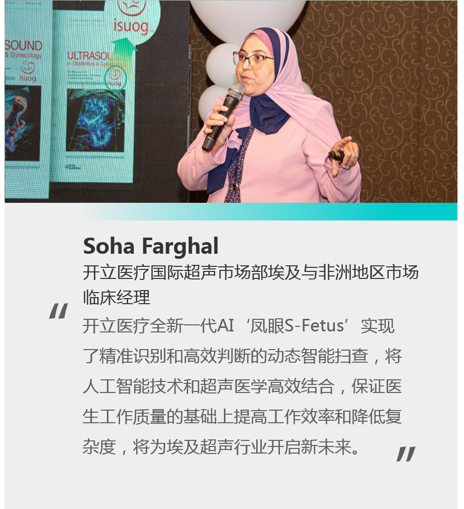 會(huì)議期間,開立醫(yī)療國(guó)際超聲市場(chǎng)部埃及與非洲地區(qū)市場(chǎng)臨床經(jīng)理Soha Farghal醫(yī)生介紹了智能超聲技術(shù)“S-Fetus”及其對(duì)孕期胎兒生長(zhǎng)發(fā)育評(píng)估的重要意義,闡述了開立醫(yī)療對(duì)于產(chǎn)前智能篩查的探索,獲得了學(xué)會(huì)專家的廣泛肯定。