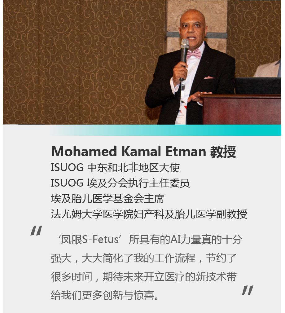 來(lái)自法尤姆大學(xué)醫(yī)學(xué)院的Mohamed Kamal Etman教授作為開立超聲的老朋友,見證了人工智能技術(shù)為開立醫(yī)療創(chuàng)新發(fā)展帶來(lái)的新契機(jī)。他直言,“鳳眼S-Fetus”簡(jiǎn)化了超聲流程,使超聲醫(yī)師能夠更高效精確地做出診斷,并在會(huì)議上對(duì)基于開立超聲基于AI技術(shù)“鳳眼S-Fetus”的智能超聲解決方案進(jìn)行了案例分享,體現(xiàn)了智能超聲技術(shù)協(xié)助醫(yī)護(hù)為患者提供更好的治療與關(guān)懷。